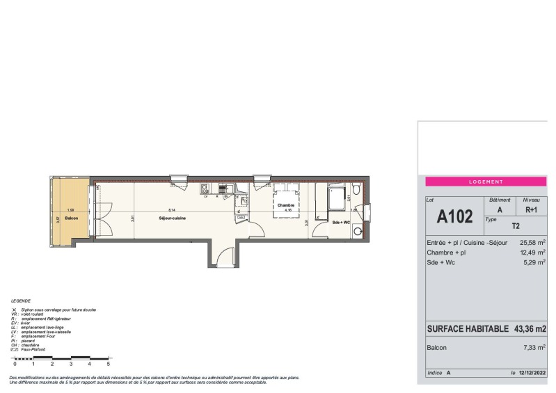 Il est composé d'une entrée, d'un séjour avec cuisine équipée , d'une chambre avec placard, d'une salle d'eau aménagée avec WC, d'un balcon de 7.33m². Il bénéficie d'une place de parking double en sous-sol.