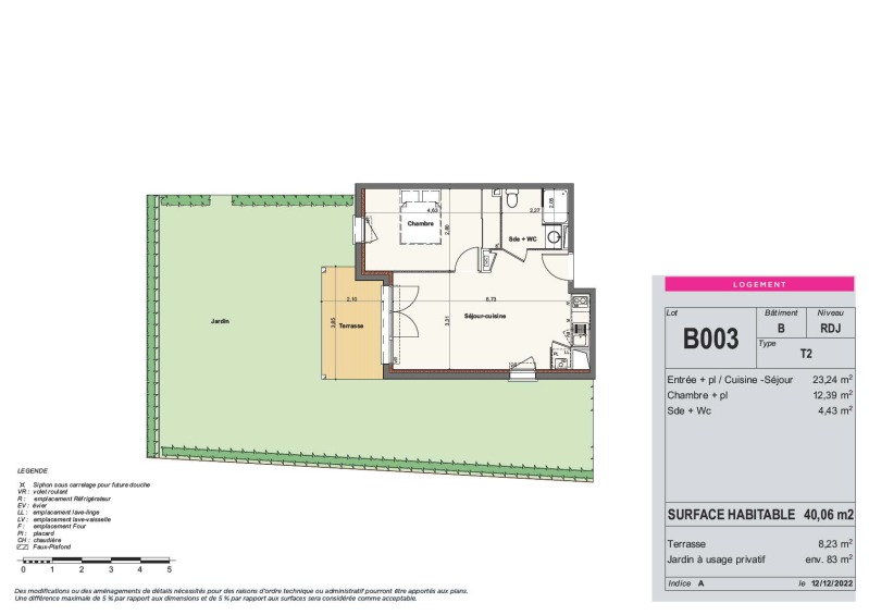 Il est composé d'un séjour avec cuisine équipée , d'une chambre avec placard, d'une salle d'eau aménagée avec WC, d'une Terrasse de 8.23m² et d'un jardin de 83m². Il bénéficie d'une place de parking double en sous-sol.