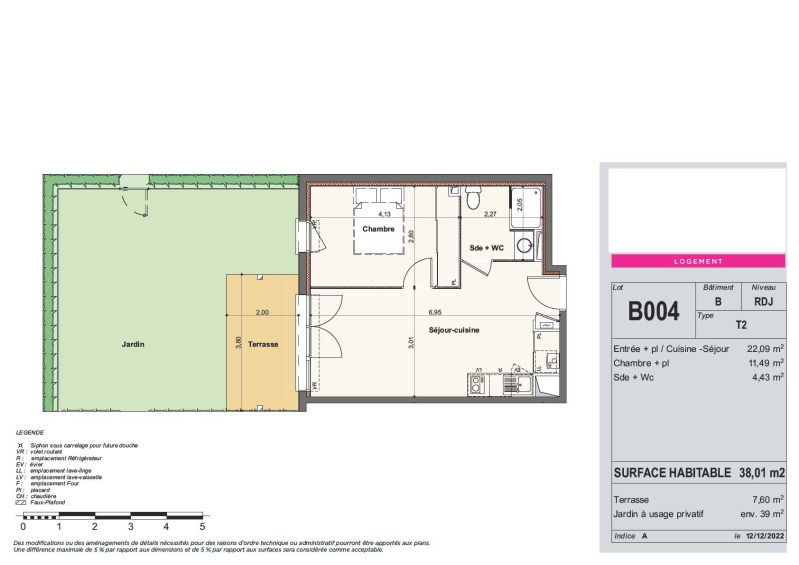 Il est composé d'un séjour avec cuisine équipée s'ouvrant sur une terrasse de 7.60m² avec son jardin de 39 m² , d'une chambre avec placard et d'une salle d'eau aménagée avec WC,. Il bénéficie également d'une place de parking double en sous-sol.