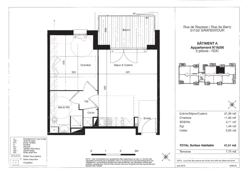 Nous vous proposons ce T2 composé d'une entrée, un séjour avec cuisine équipée (meubles hauts et bas, plaque vitrocéramique 2 feux, hotte aspirante, table top), une chambre, un cellier, salle d'eau aménagée avec wc, terrasse 7.75 m², parking sous-sol et ascenseur.