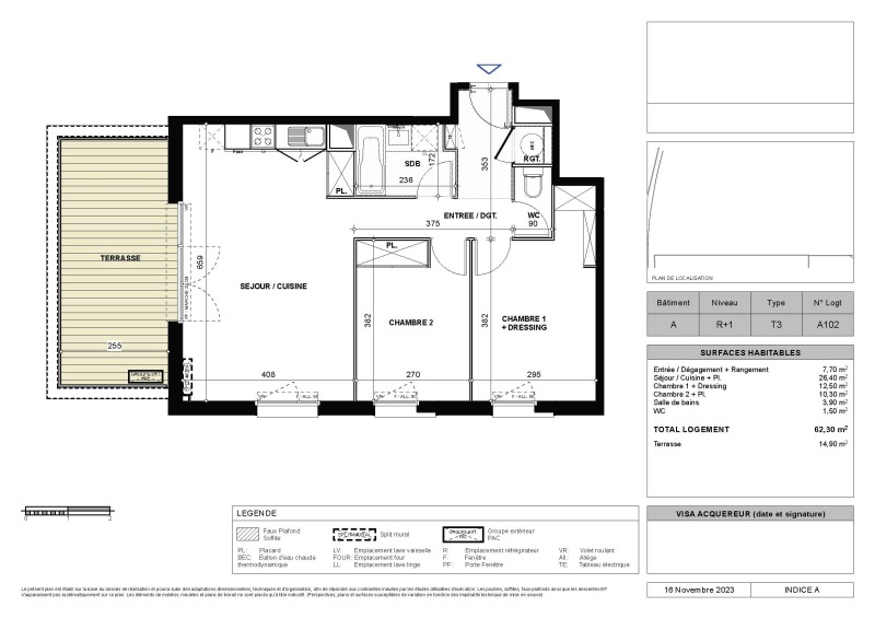 Cette résidence neuve vous propose ce beau T3 de 62.30m² avec sa magnifique terrasse de 14.90 au 1er étage !