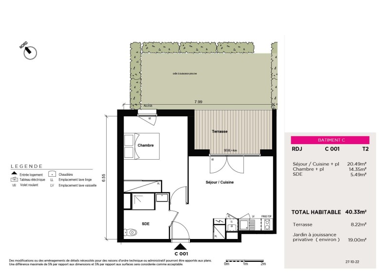 Il est composé d'une entrée avec placard, d'un séjour avec cuisine équipée s'ouvrant sur une Terrasse de 8.22m², et d'une jardin de 19.00 m², d'une chambre avec placard, d'une salle d'eau aménagée d'un wc.