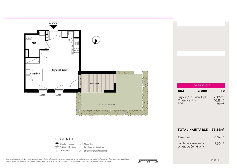 Il est composé d'une entrée avec placard, d'un séjour avec cuisine équipée s'ouvrant sur la terrasse de 6.94m² avec son jardin privatif de 17.50m² ,d'une chambre avec placard, d'une salle d'eau aménagée d'un wc.