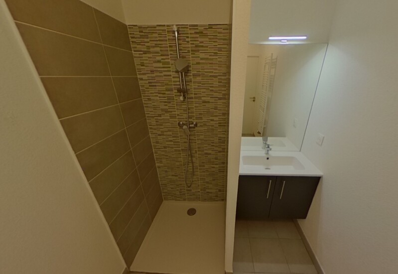 Il est composé d'une pièce à vivre avec cuisine équipée (évier inox, plaque vitro 2 feux, hotte, meubles hauts et bas, frigo top), d'une chambre avec sa salle d'eau aménagée avec wc. Le logement bénéficie d'une place de parking en sous-sol.