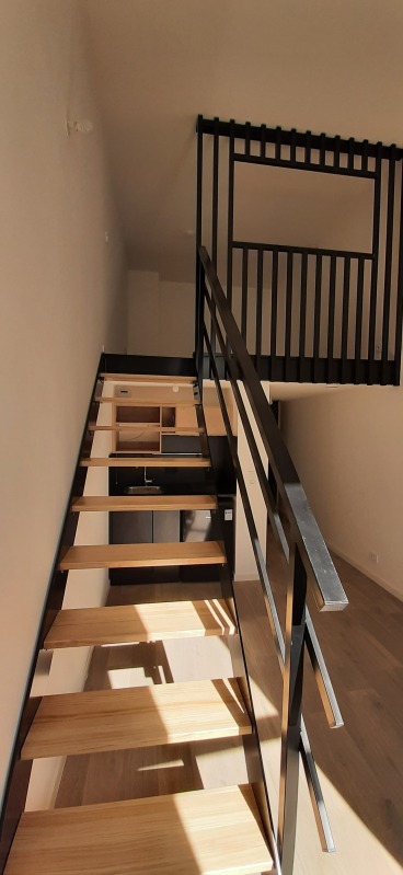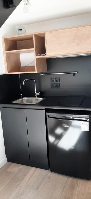 Il est composé d'une pièce de vie avec cuisine équipée (réfrigérateur top, micro-onde, plaque 2 feux, hotte, meubles hauts et bas), d'une salle d'eau aménagée avec WC et d'une mezzanine. Il bénéficie également d'une place de parking aérienne.