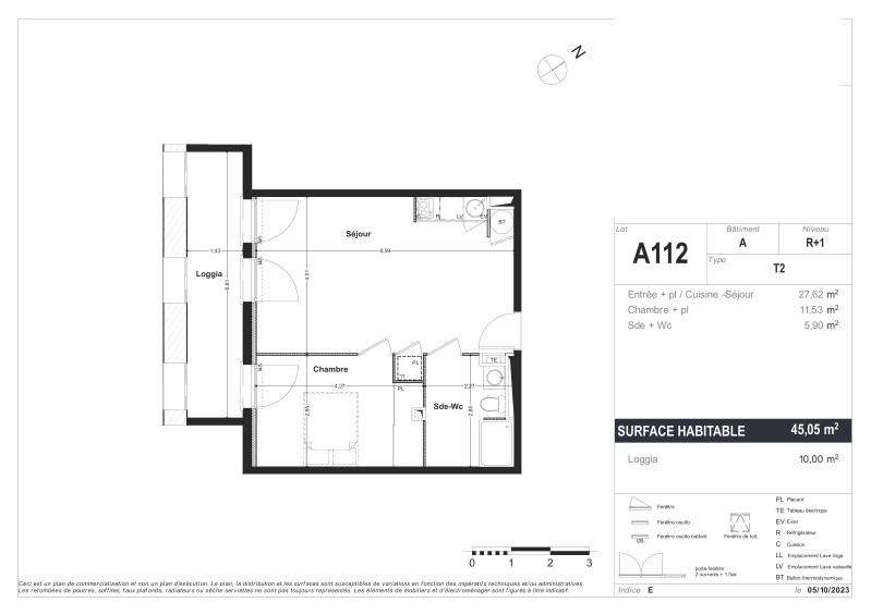 Il est composé d'un séjour avec cuisine équipée s'ouvrant sur une loggia de 10.00m² , d'une chambre avec placard, et d'une salle d'eau aménagée avec WC. Il bénéficie d'une place de parking extérieur.