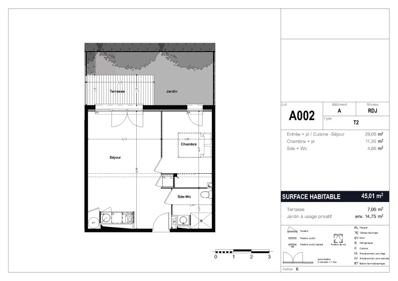 Il est composé d'un séjour avec cuisine équipée s'ouvrant sur une terrasse de 7m² et d'un jardin de 14.75m² , d'une chambre avec placard, et d'une salle d'eau aménagée avec WC. Il bénéficie d'une place de parking double en extérieur.