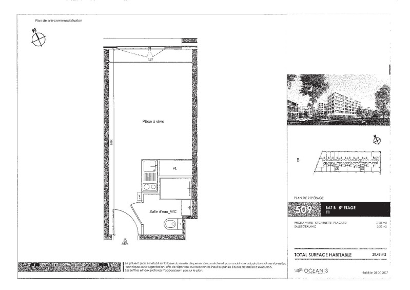Nous vous proposons ce T1 composé d'un séjour avec cuisine équipée (évier inox, plaque 2 feux, hotte, meubles hauts et bas, frigo top, micro-ondes), salle d'eau aménagée avec WC.