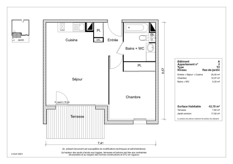Il se compose d'une entrée, d'un séjour avec cuisine équipée (Meubles hauts et bas, un évier inox, une plaque vitrocéramique 2 feux, une hotte, un réfrigérateur Top)ouvert sur une terrasse de 7.28m² avec jardin privatif de 17m², d'une chambre avec placard, d'une salle de bain aménagée avec WC et machine à laver.