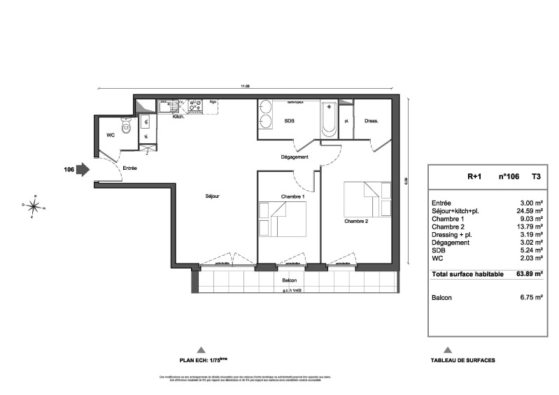 Appartement 3 pièces 63.89m²