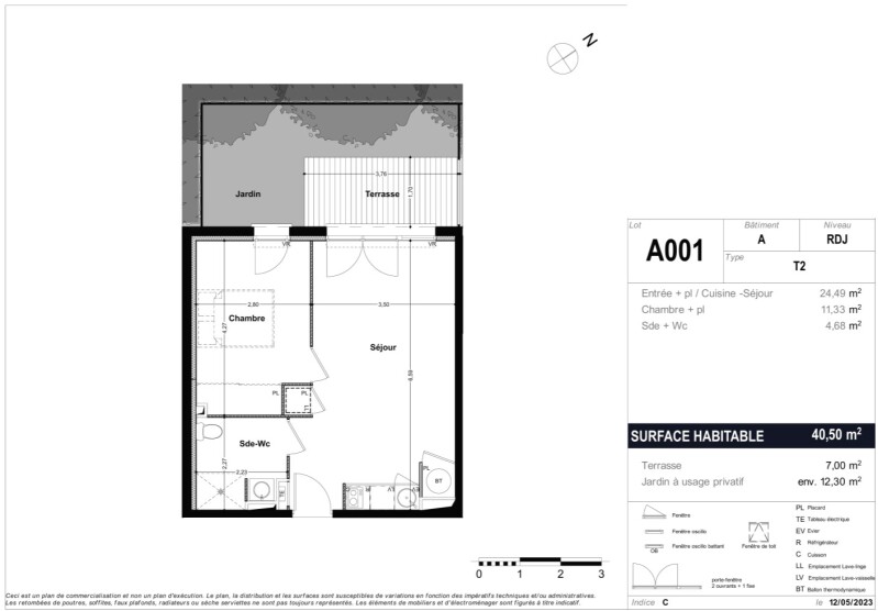 Il est composé d'une entrée, d'un séjour avec cuisine équipée s'ouvrant sur une Terrasse de 7.00m² , d'un jardin de 7.30m² et d'une salle d'eau aménagée avec WC. Il bénéficie d'une place de parking extérieur.