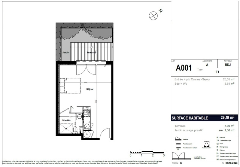 Il se compose d'une entrée, d'un séjour lumineux avec cuisine équipée, ouvrant sur une terrasse de 7 m² et un jardin privatif de 7,30 m².