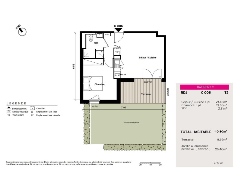 Il est composé d'un séjour avec cuisine équipée s'ouvrant sur la terrasse de 8.69m² avec son jardin privatif de 26.40m² ,d'une chambre avec placard, d'une salle d'eau aménagée avec wc.