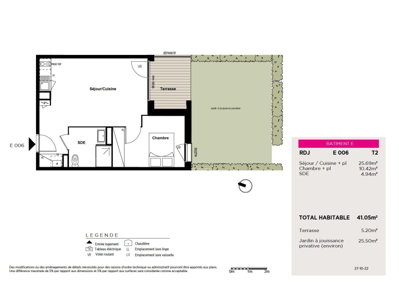 Il est composé d'un entrée, d'un séjour avec cuisine équipée s'ouvrant sur la terrasse de 5.20m² avec son jardin privatif de 25.50m² ,d'une chambre avec placard, d'une salle d'eau aménagée avec wc.
