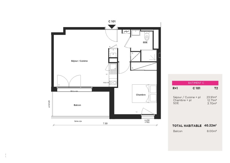 Il est composé d'une entrée avec placard, d'un séjour avec cuisine équipée s'ouvrant sur un balcon de 8.00m² , d'une chambre avec placard, d'une salle d'eau aménagée d'un wc.