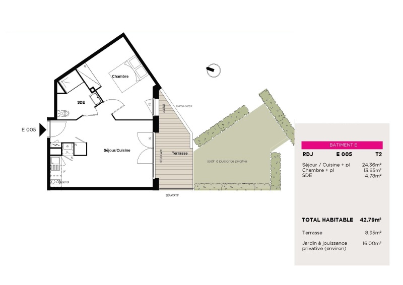 Il est composé d'une entrée avec placard, d'un séjour avec cuisine équipée s'ouvrant sur la terrasse de 8.95m² avec son jardin privatif de 16.00m² ,d'une chambre avec placard, d'une salle d'eau aménagée d'un wc.