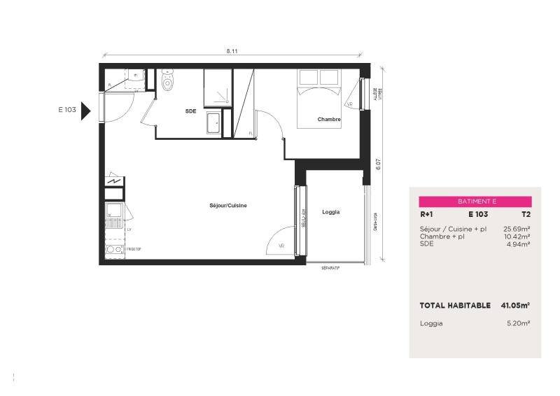 Il est composé d'une entrée avec placard, d'un séjour avec cuisine équipée s'ouvrant sur la loggia de 5.20m², d'une chambre avec placard, d'une salle d'eau aménagée d'un wc.
