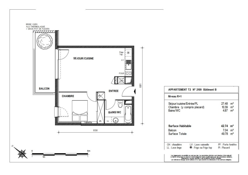 Il est composé d'une entrée, d'un séjour avec cuisine équipée (évier inox, plaque 2 feux, hotte, meubles hauts et bas, frigo top), d'une chambre avec placard, d'une salle de bains aménagée avec WC, d'un balcon de 7.04m². Il bénéficie d'un parking aérien.