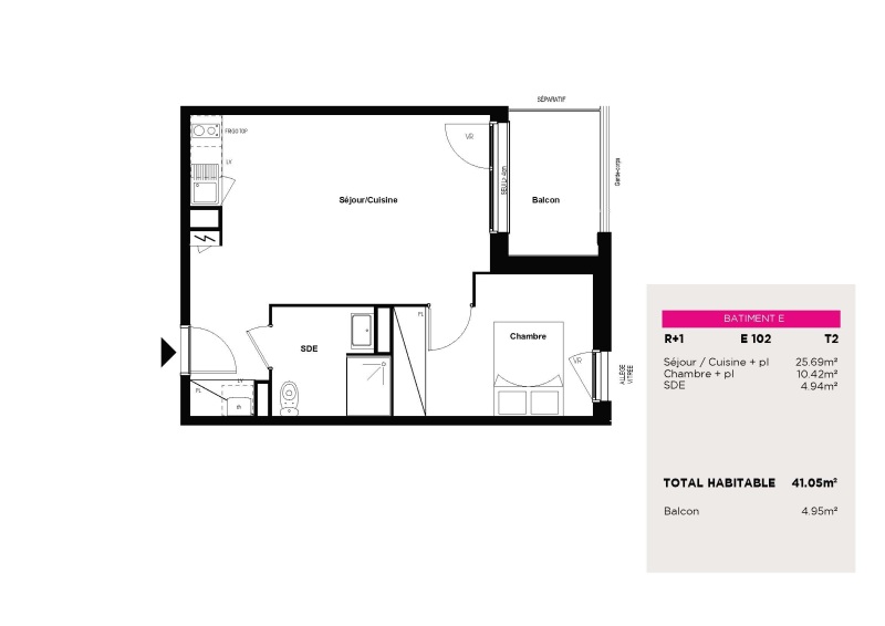 Il est composé d'une entrée avec placard, d'un séjour avec cuisine équipée s'ouvrant sur un balcon de 4.95m² ,d'une chambre avec placard, d'une salle d'eau aménagée d'un wc.