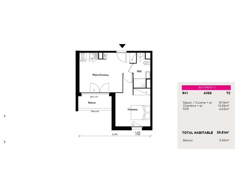 Il est composé d'une entrée avec placard, d'un séjour avec cuisine équipée s'ouvrant sur un balcon de 3.65m²,d'une chambre avec placard, d'une salle d'eau aménagée d'un wc.