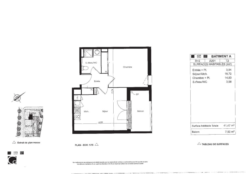 Situé au 2 ème étage et dernier étage , appartement T2 de 41,47m² comprenant une entrée avec placard, une cuisine équipée (meubles hauts et bas, plaque vitrocéramique 2 feux, hotte aspirante, réfrigérateur table top) ouverte sur le séjour et donnant sur un balcon de 7,50 m², chambre avec parquet et placard, salle d'eau avec WC, une place de parking.