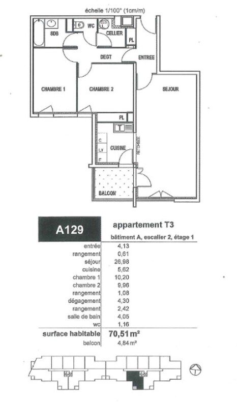 Il est composé d'une entrée,d'une cuisine fermée équipée avec ( hotte, plaque de cuisson 4 feux, cellier, meubles hauts et bas), d'un séjour avec accès sur le balcon , de deux chambres , d'une salle de bains avec meuble vasque et d'un WC séparé.