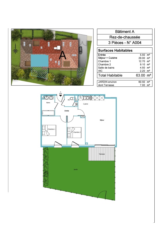 Il se compose : d'une entrée, d'un séjour lumineux avec cuisine entièrement équipée,ouvrant sur une terrasse de 7 m² et un jardin privatif de 60,50 m², deux chambres, d'une salle de bain aménagée, d'un WC séparé.