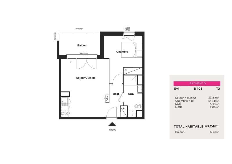 Il est composé d'une entrée, d'un séjour avec cuisine équipée s'ouvrant sur un balcon de 6.15m²,d'une chambre avec placard, d'une salle d'eau aménagée d'un wc.