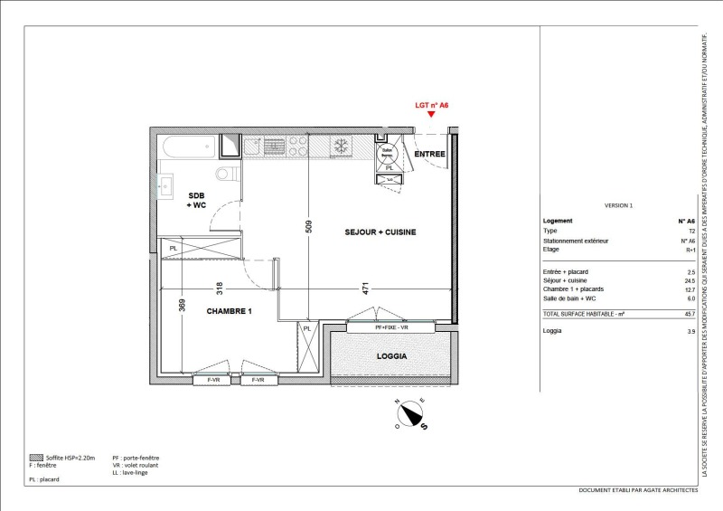 Il est composé d'une entrée, d'un séjour lumineux avec cuisine équipée (évier inox - meubles hauts et bas - hotte - plaques de cuisson), d'une loggia de 3.90m², d'une chambre avec placard, d'une salle de bains aménagée avec wc.