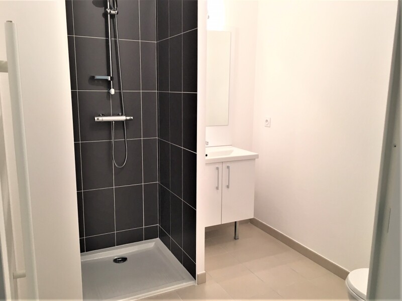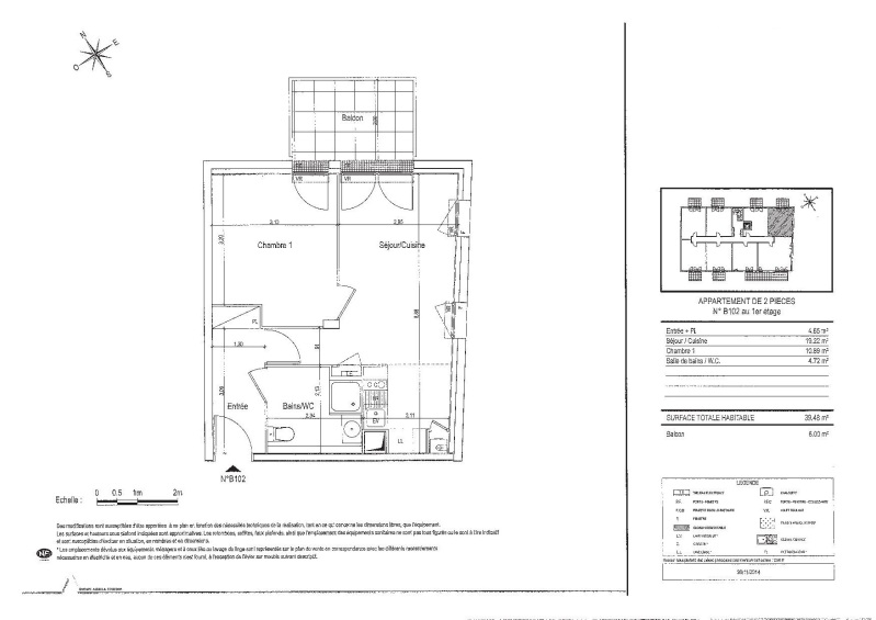 Appartement T2 au 1er étage de 39.48 m² composé d'une entrée avec placard, un séjour avec coin cuisine équipée, une chambre, une salle d'eau aménagée avec wc, un balcon de 6m², un parking aérien et ascenseur.