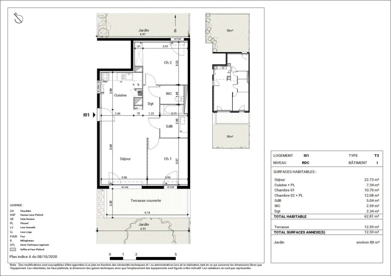 Nous vous proposons un agréable T3 composé d'un séjour avec cuisine aménagée (évier inox, plaque 4 feux, hotte, meubles hauts et bas), de deux chambres dont une avec placard, d'une salle de bains aménagée et d'un WC séparé, d'une terrasse de 12.59m² et d'un jardin de 88m².