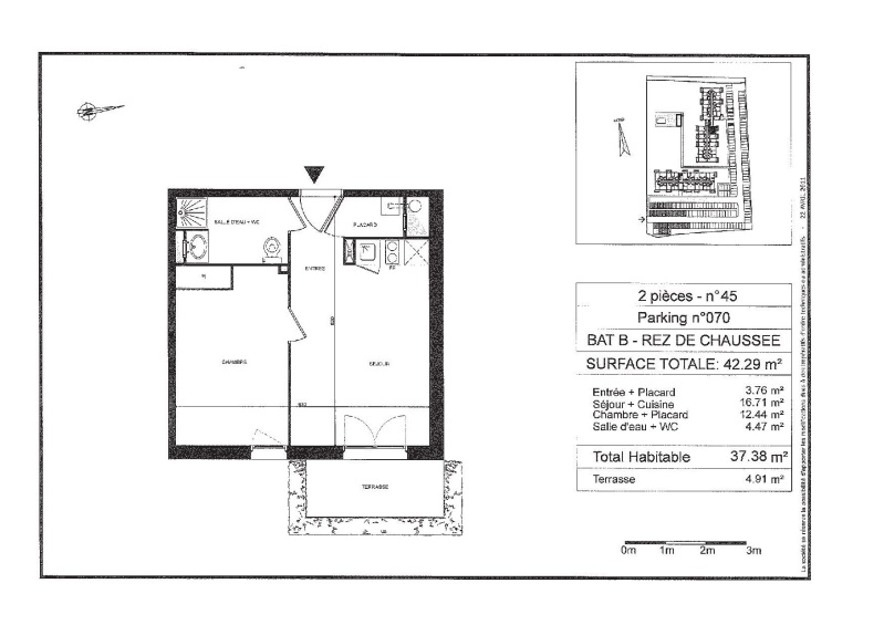 Il se compose d'une entrée avec placard, d'un séjour avec cuisine équipée (évier, plaque 2 feux, meubles hauts et bas) s'ouvrant sur la terrasse , d'une chambre avec placard,d'une salle d'au avec wc ainisi qu'un parking aérien.