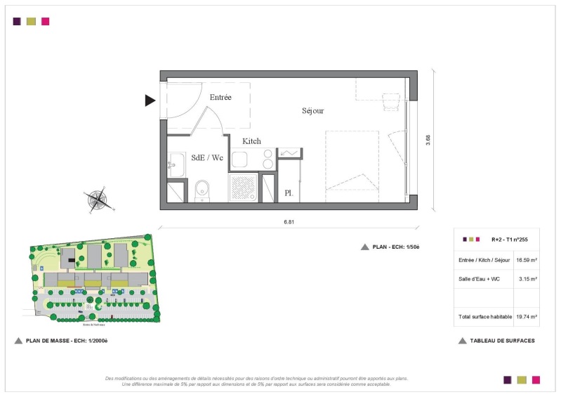 Il se compose d'une entrée, d'un séjour lumineux avec cuisine équipée (évier inox, plaque 2 feux, hotte, meubles hauts et bas, frigo top), ainsi que d'une salle d'eau aménagée avec WC. Une place de parking aérien est incluse.
