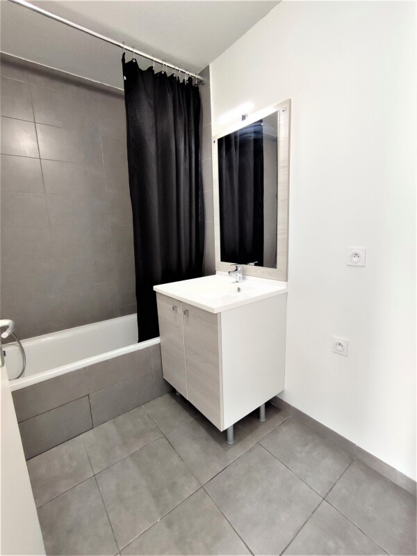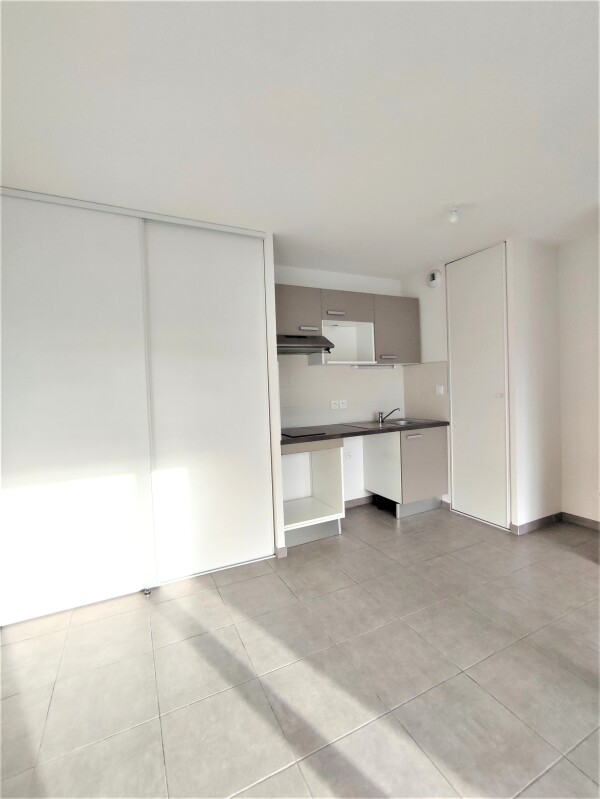 TOULOUSE, proche du métro et de la sortie 13 Borderouge, joli T2 avec double exposition, composé d'une pièce à vivre avec son espace cuisine équipée (évier inox, plaque 2 feux, hotte, meubles hauts et bas, ), d'une chambre avec placard, d'une salle de bains aménagée
