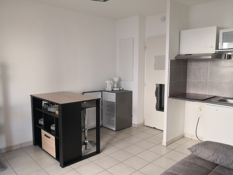Dans une résidence proche des commerces et des transports studio meublé lumineux idéal étudiant entrée, pièce de vie avec Clic-clac, cuisine équipée (Réfrigérateur, machine à laver, micro-ondes Grill, machine à café, Bouilloire,...), salle d'eau aménagée avec toilette et une terrasse de 5.00m².