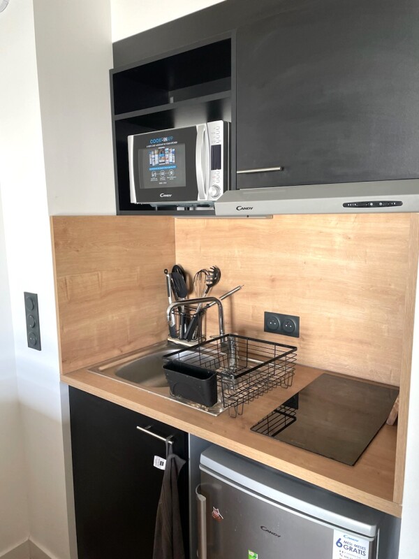 L'appartement se compose d'une entrée, d'un séjour élégant et optimisé avec cuisine équipée (évier, plaque 2 feux, hotte, réfrigérateur table top, micro-ondes, set vaisselle et cuisson), d'un canapé convertible 3 places, d'une table basse, ainsi que d'un meuble multifonction design faisant office de bar et d'espace bureau.