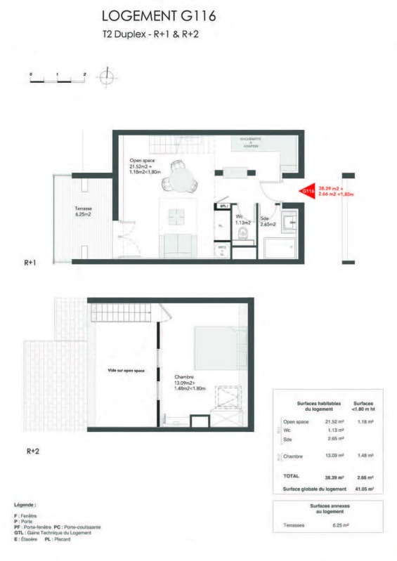 Il est composé d'une entrée, d'un séjour avec cuisine équipée (évier, plaque de cuisson, hotte, meubles hauts et bas), d'une chambre, d'une salle d'eau aménagée et d'un WC séparé, d'une terrasse de 6.25m². Il bénéficie d'un parking aérien.