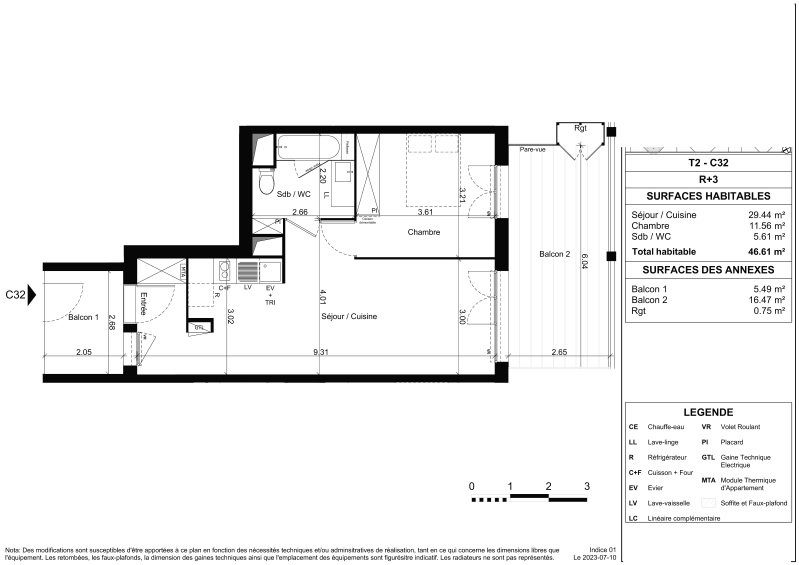 Il se compose d'une entrée donnant sur un premier balcon de 5.49m², d'une pièce à vivre lumineuse avec cuisine équipée (évier inox, plaque 2 feux, hotte, meubles hauts et bas), d'une chambre avec placard intégré, d'une salle de bain aménagée avec WC, ainsi qu'un coin pour le rangement.