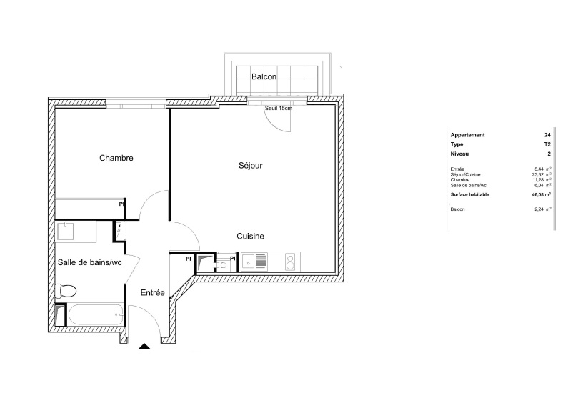 Appartement 2 pièces 46.08m²