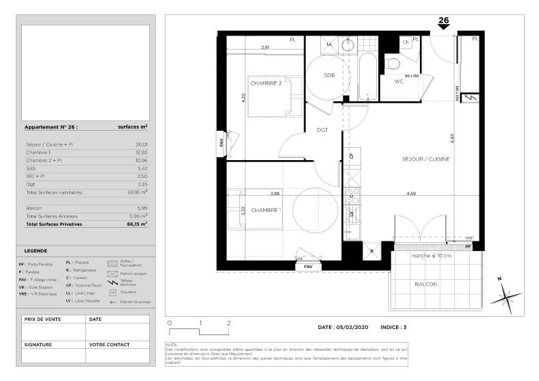 Nous vous proposons cet agréable T3 composé d'une entrée, d'un séjour avec cuisine équipée (évier inox, plaque 4 feux, hotte, meubles hauts et bas), de deux chambres dont une avec placard, d'une salle de bains aménagée, d'un WC séparé et d'un balcon de 5.99m². Il bénéficie d'une place de parking en sous sol.