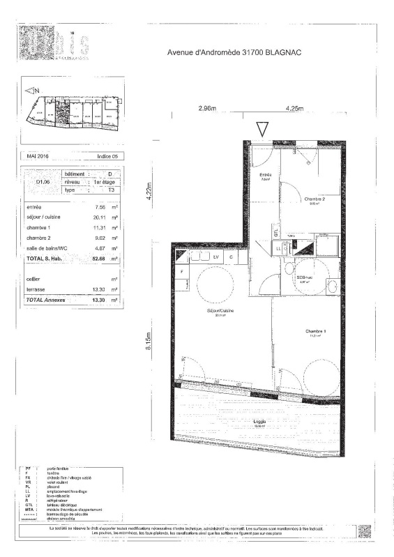 Il se compose d'une entrée, d'un séjour lumineux avec cuisine équipée (évier inox, plaque 2 feux, hotte, meubles hauts et bas) ouvert sur une terrasse-loggia de 13,30 m², idéale pour vos moments de détente.