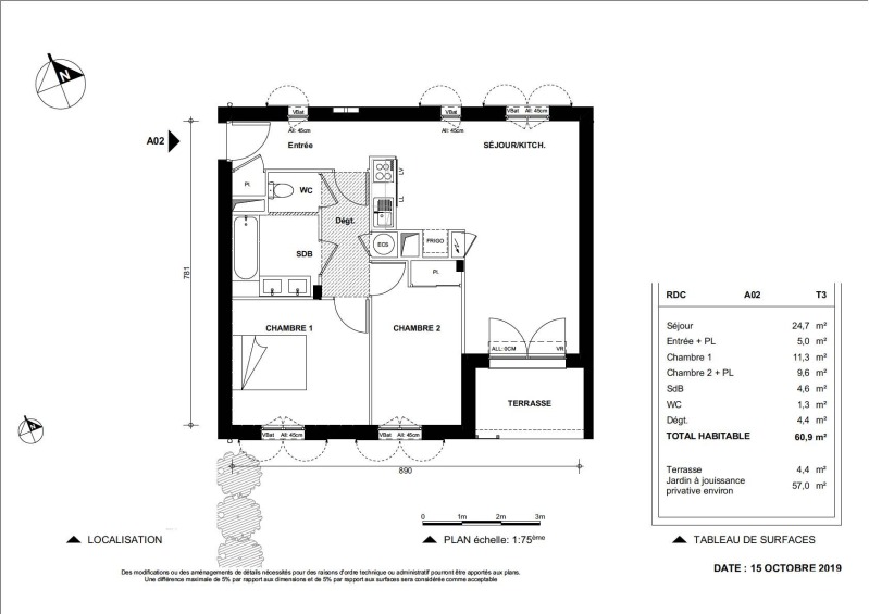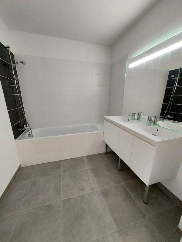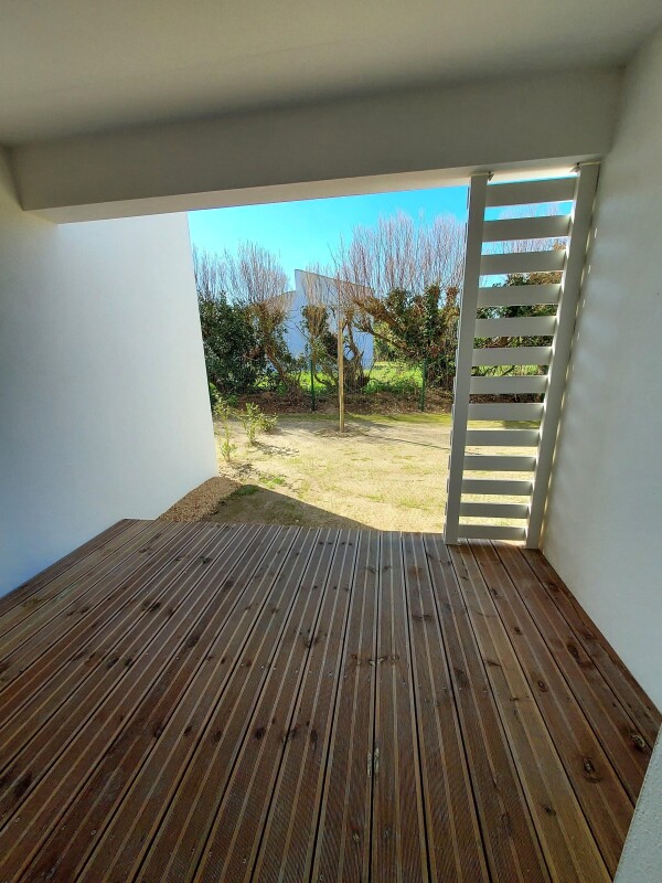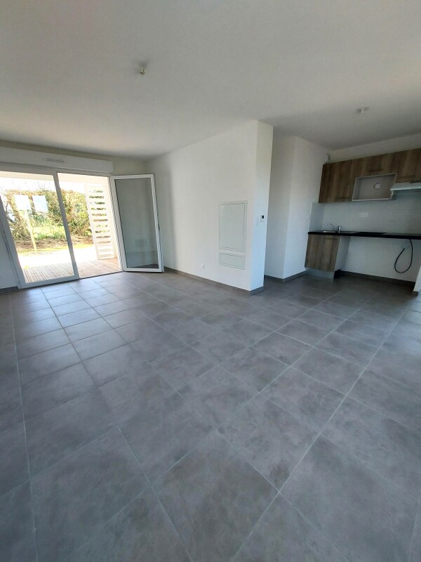 Nous vous proposons un agréable T3 composé d'une entrée, d'un séjour avec cuisine équipée (évier inox, plaque 4 feux, hotte, meubles hauts et bas), de deux chambres dont une avec placard, d'une salle de bain aménagée, d'un WC séparé et d'une terrasse de 4.4m² et d'un jardin de 57.00m².