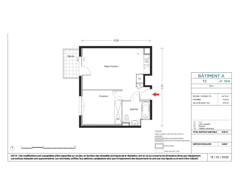 Pièce de vie à aménager selon tes envies avec coin cuisine équipée (plaque électrique deux feux, frigo, four, meules haut et bas) ouvrant sur un balcon, une chambre avec placard intégré, salle de bain avec WC.
