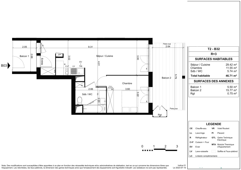 La pièce de vie s'ouvre sur un grand balcon de 15.77 m², idéal pour profiter de l'extérieur en toute saison.