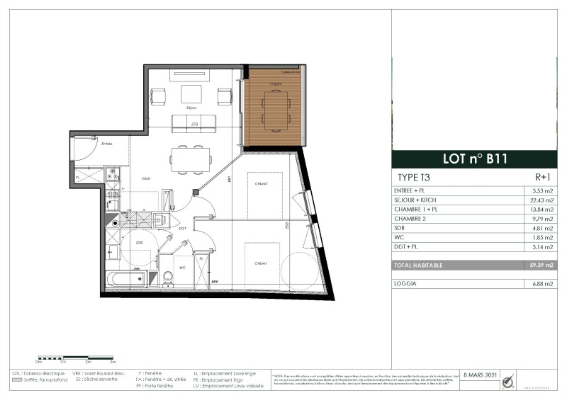 Nous vous proposon un agréable T3 composé d'une entrée, d'un séjour avec cuisine équipée (meubles haut et bas - évier - Plaque Induction 3 Feux - Hotte - Micro-ondes - Lave Vaisselle - Four Pyrolyse), de deux chambres dont une avec placard, d'une salle de bain aménagée, d'un WC séparé et d'une loggia de 6.88m². Il bénéficie d'un parking en sous sol.