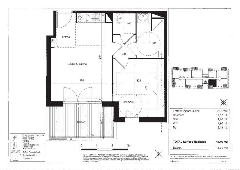 Il est composé d'une entrée, un séjour avec cuisine équipée (meubles hauts et bas, plaque vitrocéramique 2 feux, hotte aspirante, table top) s'ouvrant sur un balcon de 8.30m² , d'une chambre,d'une salle d'eau aménagée et d'un wc.