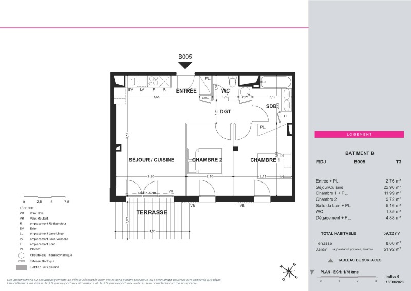 Il se compose d'une entrée, d'un séjour avec cuisine équipée (Evier Inox, meuble haut et bas, plaque 4 feux, hotte) s'ouvrant sur une terrasse de 8.00m², de deux chambres dont une avec placard, d'une salle de bain aménagée, d'un WC et d'un jardin de 51.92m². Il bénéficie de deux places de parking extérieur.