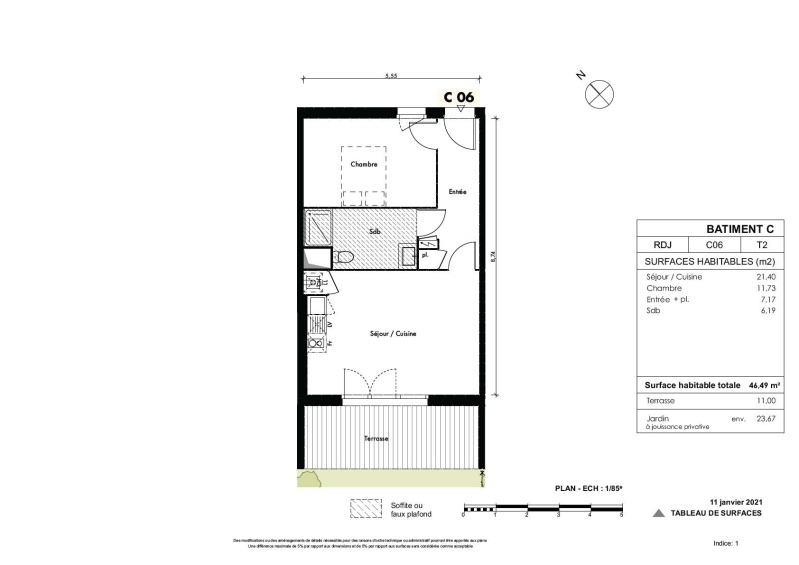 Nous vous proposons un agréable T2 composé d'un séjour avec cuisine équipée (évier inox, plaque 2 feux, hotte, meubles hauts et bas, réfrigérateur top), d'une chambre , d'une salle d'eau aménagée avec WC, d'une terrasse de 11.00m² et d'un jardin de 23.67 m² . Il bénéficie de deux places de parking en extérieur.
