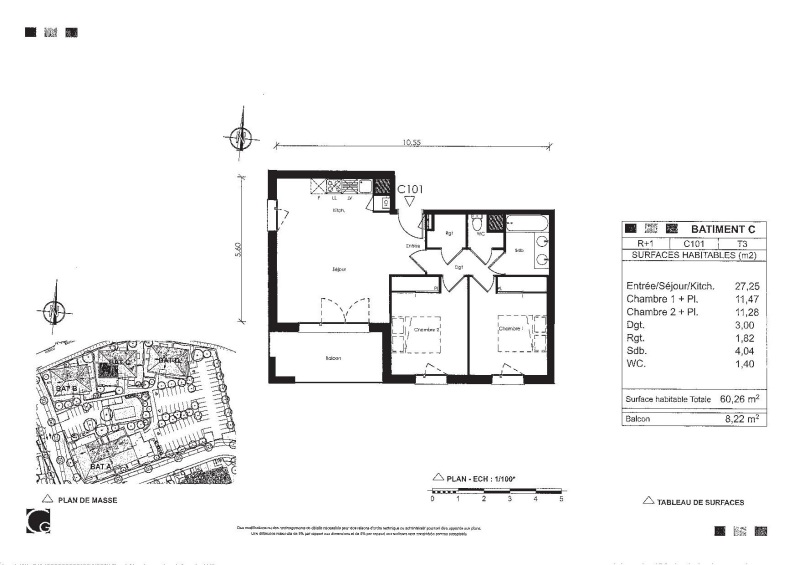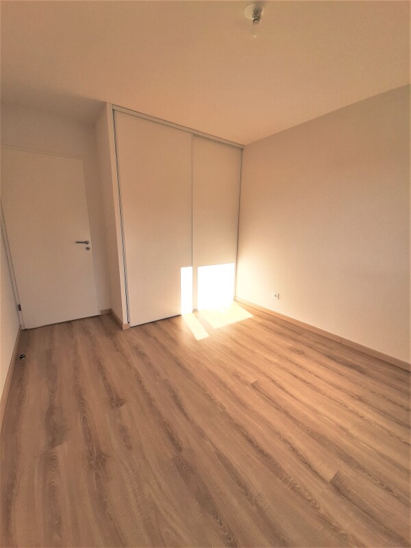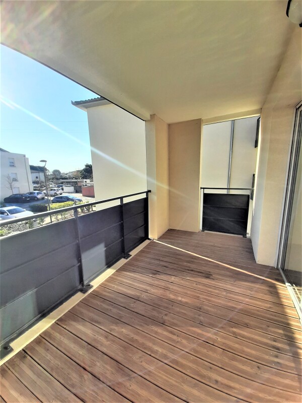 L'appartement est composé d'une entrée avec placard, séjour avec cuisine aménagée (évier inox, plaque 4 feux, hotte, meubles hauts et bas), deux chambres dont une avec placard, salle de bain aménagée et WC séparé, un balcon de 8.32m² , un parking aérien.
