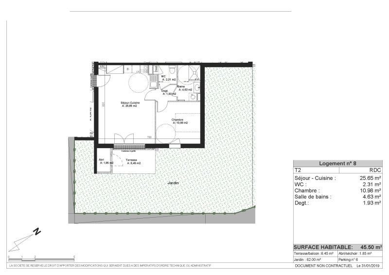 Il se compose d'un séjour lumineux ouvert sur une cuisine entièrement équipée (évier inox, plaque 2 feux, plan de travail, hotte, meubles hauts et bas), d'une chambre confortable ainsi que d'une salle de bains aménagée. Les WC sont indépendants pour davantage de confort.